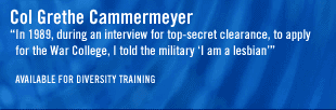 | Activist and Author, Serving in Silence Colonel Grethe Cammermeyer, RN, PhD: USA retired nurse, soldier, political activist, mom, grandmother, and student, is an avid spokesperson for lifting the ban against gays and lesbians in the military. Using the military as the paradigm she weaves stories of social change, stressing the necessity to change the military as well as the corporate workplace to an accommodating environment for everyone. The challenge to the sexual minority community in disclosing and the challenge to the sexual majority to feel less threatened is illustrated as she shares anecdotes about grappling with her own sexuality, dealing with her children, being a political candidate and now an activist. During her military career she challenged policies that discriminated against married women, and married women who became pregnant. In 1989, Colonel Cammermeyer, having served for 25 years, challenged the military's anti-gay regulation. Her story drew national attention since she was nationally recognized as a specialist in neuroscience nursing, was Veterans Administration Nurse of the year in 1985, had earned the Bronze Star for Service in Vietnam, was Chief Nurse of the Washington National Guard, and had an earned Ph.D. in Nursing Science. Her book Serving in Silence (with Chris Fisher) was published in 1994. In 1995 a made-for-television movie, Serving in Silence, in which Glenn Close portrayed Colonel Cammermeyer was aired earning the Peabody award and three Emmy Awards. In June 2010, Col. Cammermeyer was selected as a member of the Defense Advisory Committee on Women in the Services, (DACOWITS). In April, 2011, she received "The Point Legend Award," which is presented to an individual who has, through the course of his or her lifetime, achieved greatness in their professional career and unapologetically supported the LGBT community. It was presented by the Point Foundation (www.pointfoundation.org), the nation's largest scholarship granting organization for lesbian, gay, bisexual and transgender (LGBT) students of merit. The Cost of Serving in Silence The cost of serving and living in silence is extraordinary to the individual, the family, the corporate world, the church and reality. It is not just a simple "why can't you just be quiet?" as Senator Warner asked Colonel Cammermeyer at the Senate Armed Services hearing in 1993 on lifting the ban against homosexuals serving in the military. Col. Dr. Margarethe Cammermeyer's compelling story of trials and tribulation in the military, to running for public office, to dealing with children and grandchildren give her a unique perspective of the costs and benefits of an open accepting society and work environment. The weaving of her own experiences with the changes in society makes the topic of gays in the military and in society and ever present and challenging topic of her lectures and discussions. Demystifying the unknown is the only way to challenge even subliminal biases. The benefits are in providing a safer work place, challenging prejudices, providing security with respect to home family and community. It occurs one person at a time coming out and speaking their truth. Colonel Cammermeyer's truth cost a military future and gained her the respect and integrity of all who hear her story. Her story is an exemplar of the lives of thousands unsung and unheard in America. Vistit: Cammermeyer.com |