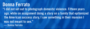 | Photojournalist, filmmaker and domestic violence activist An award-winning photojournalist and author of Living with the Enemy, for over twenty-two years Ferrato has devoted her life to documenting, exposing, and preventing the abuse of women and children by the ones they love. Ferrato is founder of the Domestic Abuse Awareness Project or DAAP, the nation's only visual archive on the subject of Domestic Violence. From the National Coalition Against Domestic Violence to magazines like LIFE, TIME arid US News and World Report opinion makers declare that her photographs have changed laws and consistently challenged ignorant attitudes promoted by society about violence against women and children. Her domestic violence documentation has appeared in every major magazine and, in television reports on domestic violence, including The Oprah Winfrey Show, OXYGEN, CBS' America Tonight, Good Morning America, Dateline, Eye on America, NBC Now, The Crusaders and Court TV. The Unbeaten Woman A visual journey in and out of violence in relationships Donna Ferrato's multimedia program, with slides and music, begins with images of relationships where respect is a cornerstone and love and caring provides a safe haven. She then takes you into the painful world of violence in relationships, where home is no longer safe, for a clearer understanding of how abuse affects all of our lives, of the injustices faced by victims, and how we can stand up to combat this tragedy. It is a program about women who have traveled from being victims of violence to becoming empowered to find peace and wholeness to thrive in life. |